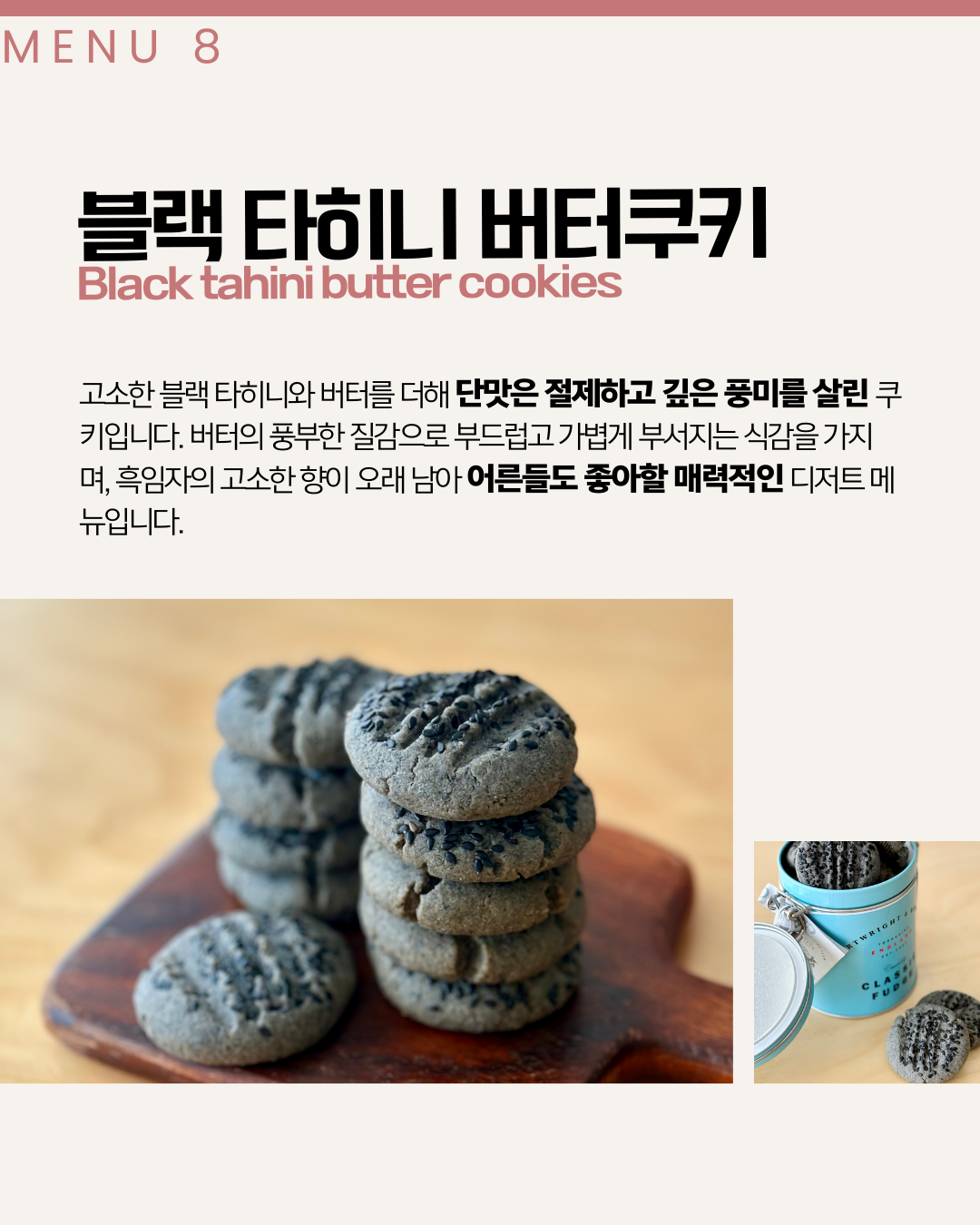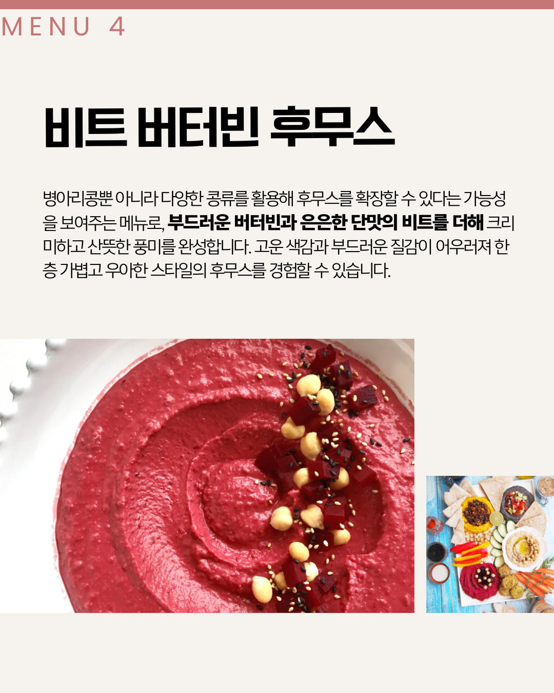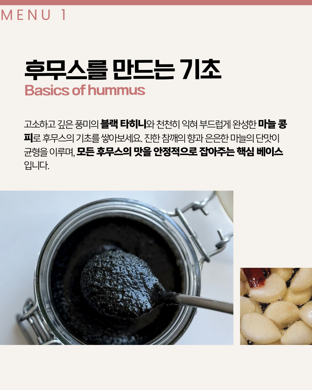 후무스의 주재료는 병아리콩이지만 블랙 렌틸, 버터빈 등 다른 콩을 사용하여 조금 더 색다른 맛을 만들어보고자 했습니다. 맛의 차이는 미묘하지만 종류에 따라 건강적 가치도 달라 다양한 콩을 시도해보는 것이 의미가 있다는 판단에서입니다.